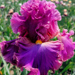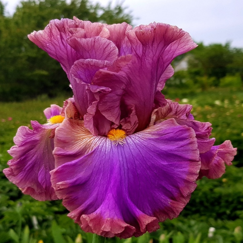 Ирис высокий бородатый Fashionable Late (Фэшинебл Лейт). Ирис с потрясающей окраской. Стандарты переливающиеся розовато-фиолетовые. Фолы чуть краснее с золотым напылением. Бородка красная. Цвет насыщенный, шикарная гофрировка.
