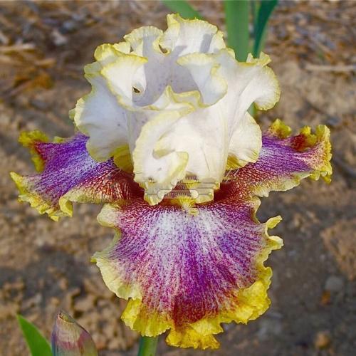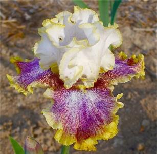 Чудесный средне-поздний высокорослый ирис Ring Around Rosie, достигающий 100 см в высоту. Сорт фантастической красоты, с крупными волнистыми лепесткамии едва уловимым, но очень приятным цветочным ароматом. Белые стандарты обрамлены тонкой золотой кромкой, фолы испещрены лиловым узором и украшены ярко-желтой пликатой по краю. Сорт обладает отличным уровнем адаптации, легко приживаясь на новом месте, а также отличается хорошей выносливостью и устойчивостью к заболеваниям.