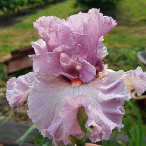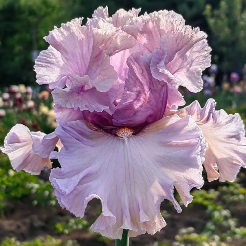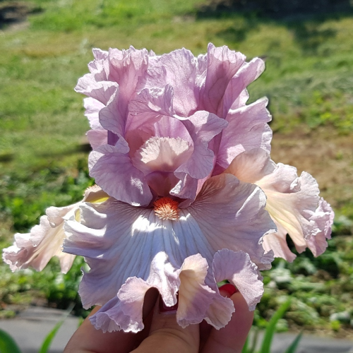 Очень красивый ирис .По факту гораздо выразительнее ,чем на предоставленных фото. Цвет стандартов и фоллов более насыщенее и ярче, розовато сиреневого тона и светло фиолетового оттенка. Стандарты пыльно сиреневого-фиолетового цвета. Светлые фоллы с каймой цвета стандартов, на плечиках которых коричневое жилкование и ярко красная бородка с белым кончиком. Хорош. Единственный минус - это расположение цветов, слишком близко друг от друга.