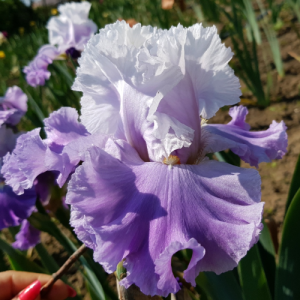 Гофрирированный, кружевной. Широкие, соприкасающиеся. плечики. Хорошее ветвление, до 6 цветоносов. Ранне-среднего сезона цветения. Имеет выраженный сладкий аромат. Стандарты - нежнейшие бело-лавандовые, фолы - густо-пастельно-лавандовые, бородка - белая со слабым красным вкраплением.