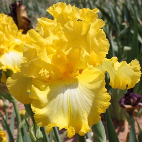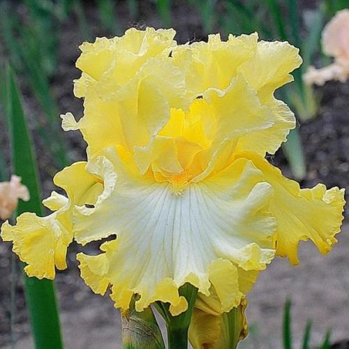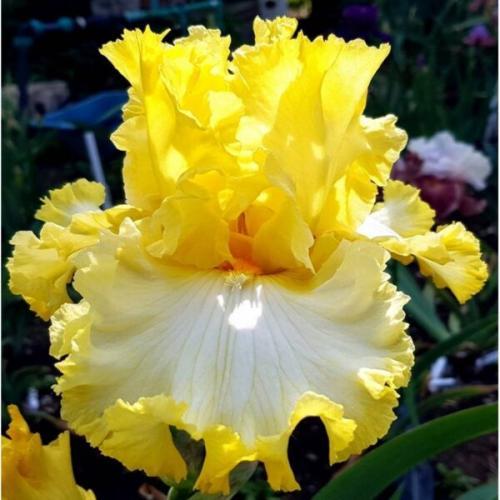 Исключительный яркий сорт. Стандарты золотистые. Фолы с большим белым пятном и широким размытым кружевным кантом. Бородка золотая. Куст мощный, крупный. Высота 102 см. Имеет множество наград.