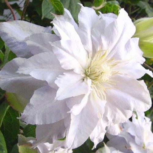 Вьющиеся плети-лианы кустарника способны достигнуть 3 м длины. В начале сезона растение великолепно цветет пышными, многолепестковыми, махровыми цветами. Белоснежные лепестки имеют сильно волнистую, вытянуто-овальную форму с острыми кончиками. Едва заметные розовато-желтоватые оттенки и желтое тычиночное пятно в центре, лишь подчеркивают основной окрас. В августе наступает повторное цветение. Здесь цветки имеют простое плоское строение. Лишь лепестки немного изгибаются наружу.
