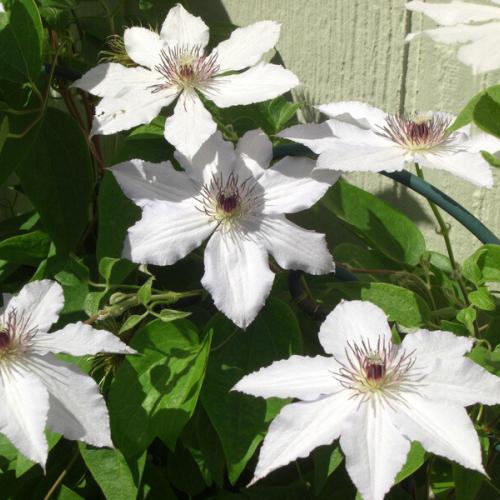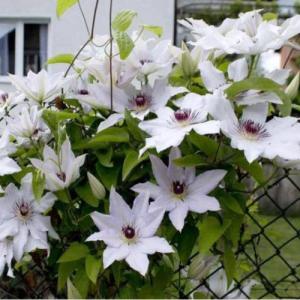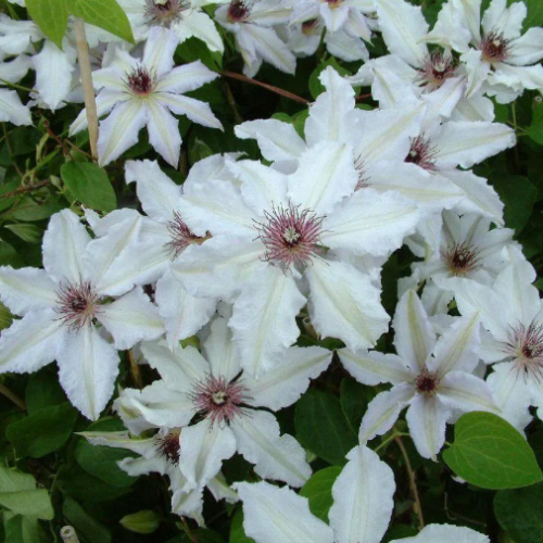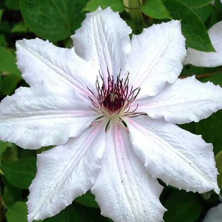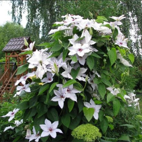 С первых дней мая и по конец августа он будет напоминать собой огромный снежный сугроб, не тающий под солнцем, не разметаемый ветрами и не разбиваемый дождями. С момента раскрытия первого бутона и до опадания последнего лепестка, клематис Snow Queen хранит нерушимую и холодную красоту, освежающую в жаркий летний день. Плотные и причудливо переплетающиеся побеги несут на себе крупные цветки-снежинки, достигающие 18 см в диаметре. Огромные бархатистые лепестки излучают неясное мерцание и обладают легкой сиреневатой дымкой, сочетающейся с ярко-малиновыми кончиками тычинок. Этот ценный и редкий сорт.