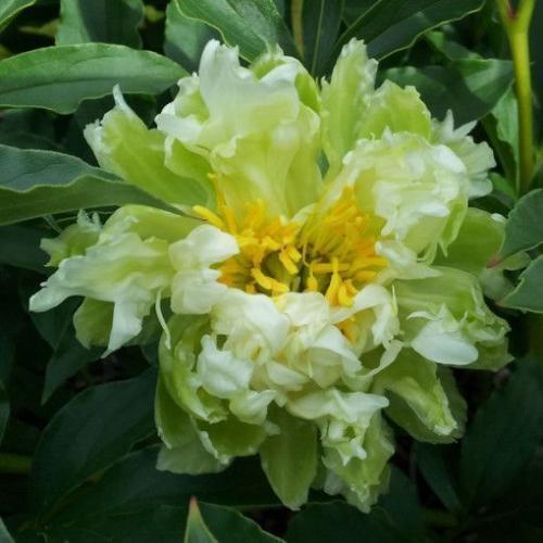 Пион Green Halo межвидовой гибрид. Кактусовидный. Цветок размером 14 см. Слегка ароматный. Очень много боковых бутонов, что обеспечивает продолжительное цветение. Цветок полумахровый. Куст компактный 80 см высотой, красивой формы, хорошо облиственный. Листва темно-зеленая.