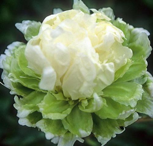 Эксклюзив! Махровый, взбитый кремовый шар лежит на зеленых широких нижних лепестках. Очень модное и востребованное сочетание белого с зеленым. Редкий коллекционный сорт. Окраска, размер и форма цветка, присущая сорту, полностью проявляется на 3-4-й сезон цветения.