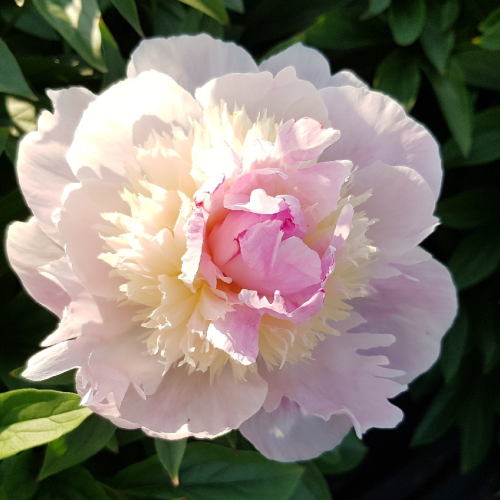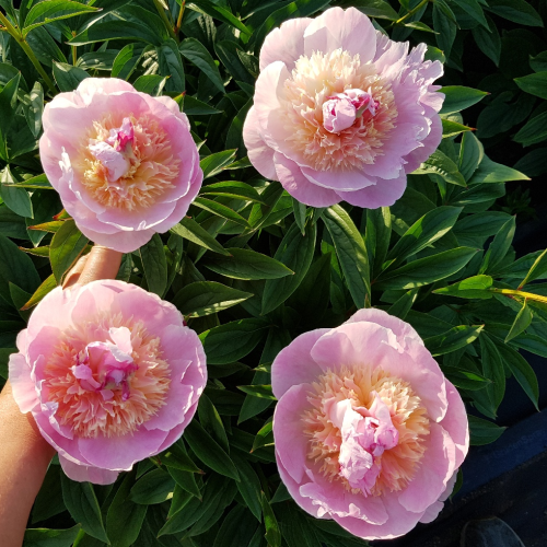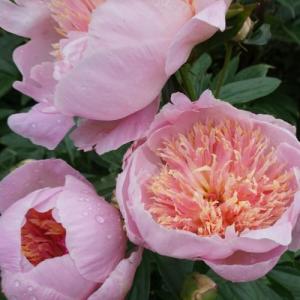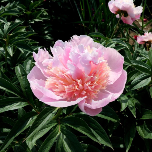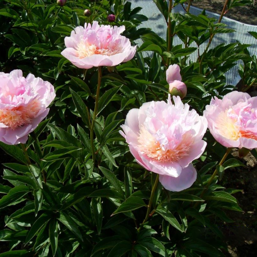 Очаровательный пион. Розово-сиреневый - играет множеством переливов :розовых,сиреневых,кремовых .Цветок в форме пиалы, в которой расположены высокие, кремово-розовые, с карминным отблеском и золотым окаймлением стаминодии. В центре несколько длинных лепестков с ярко-красными отметинами на кончиках. Быстро нарастает. Легкий в вырашивании.