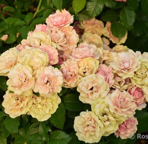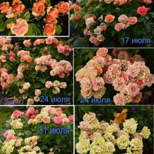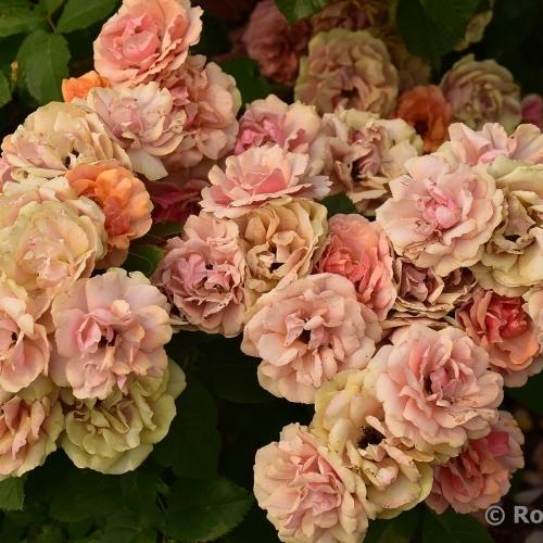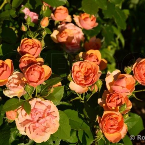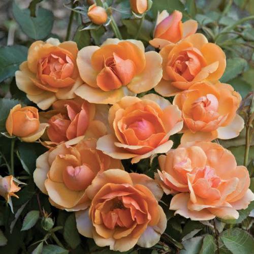 Флорибунда. Яркий оранжевый цвет при раскрытии бутона постепенно светлеет до розово-абрикосовых оттенков. Цветки состоят всего из 30 лепестков, но прекрасно выдерживают непогоду и присутствуют в течение всего сезона на компактном, густом кусте с устойчивой к заболеваниям листвой.