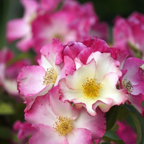 Роза Лиола. Сортосерия «Бабочки». Она имеет очарование дикой розы, благодаря своим простым цветкам с пятью волнистыми лепестками. Цветки вначале светло-жёлтые с небольшой окантовкой карминного цвета, затем жёлтый цвет переходит в цвет слоновой кости, а карминный цвет «растекается» почти по всему лепестку. Лепестки прочные, хорошей текстуры, что обеспечивает цветкам долгую жизнь и устойчивость к дождю. Аромат средний. Цветение обильное, эффектное, повторное. Соцветия многочисленные. Листва тёмная, матовая, устойчивая к болезням. Куст сильный, густой, прямостоячий.