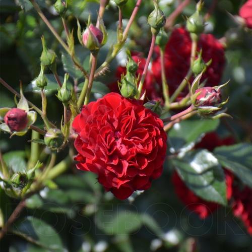 Цветки старомодной формы ярко-красного цвета, из 26-40 лепестков, с мягким яблочным ароматом.Листва плотная, темно-зеленая, полу-глянцевая. Высокая устойчивость к грибным заболеваниям. (Helpmefind.com)
