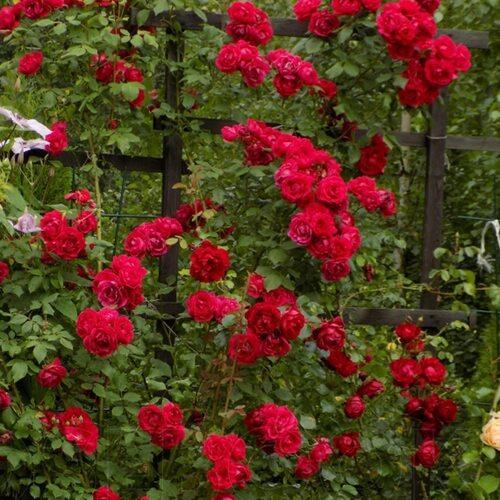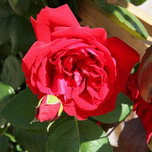 "Роза хороша. Редкое сочетание ощутимого яблочного аромата и длительной жизни цветка. Цветение обильное, долгое, повторное. Цвет сияющий красный. Отличная устойчивость к болезням. Зимует хорошо при правильном укрытии. Строение куста чем-то похоже на Eden Rose. Не очень колючая."