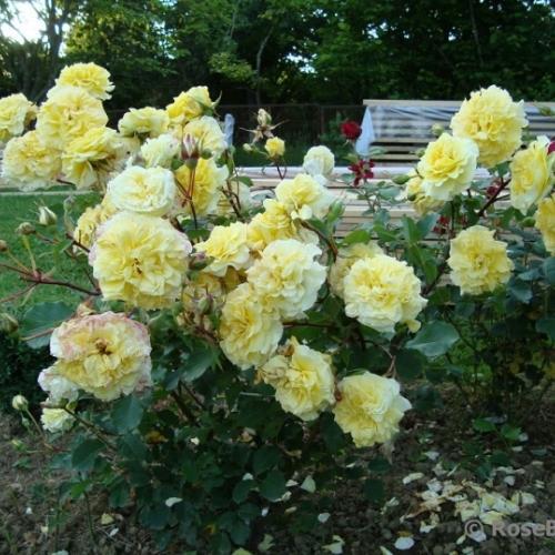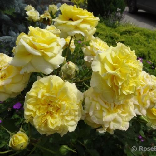 Очень мощная роза. Быстро нарастает, почти непрерывно цветет кистями довольно крупных цветков, которые долго держутся и в жару, и в дождь. Хорошо зимует, не болеет. Побеги прочные, хорошо держат тяжелые шапки цветов. Во второй половине лета побеги нарастают выше 200 см, куст немного разваливается. Чудесный медово-лимонный аромат."