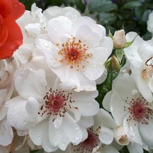 Красивый куст идеальной куполообразной формы. Густая темно-зеленая листва долго сохраняет декоративность. С начала мая и до поздней осени цветет роскошными кистями белых цветков. Создается такое впечатление, что куст припорошен снегом. Вблизи видно, что молодые цветки – бледно-розовые, полумахровые. Раскрываясь, они становятся белыми, почти плоскими, до 10 см в диаметре. В центре видны эффектные оранжевые тычинки и желтая пыльца, на которую слетаются пчелы и другие насекомые. Особенно ароматны раскрывающиеся бутоны. Запах легкий, свежий, мускусно-лимонный. Очень рекомендуем. (VER)