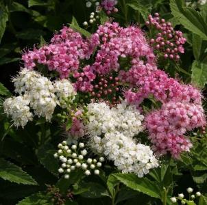 Спирея японская Генпей или Широбана - декоративный, невысокий кустарник с округлой кроной, отличающийся очень эффектным цветением белыми, розовыми и красноватыми плоскими щитковидными соцветиями появляющиеся на кусте одновременно.