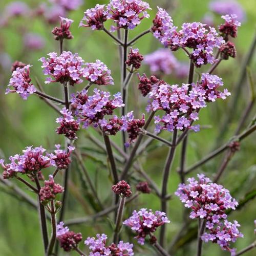 Высокая эффектная вербена с фиолетовыми соцветиями.Имеет сильные, прочные, длинные стебли. Цветки собраны в плотные зонтики.